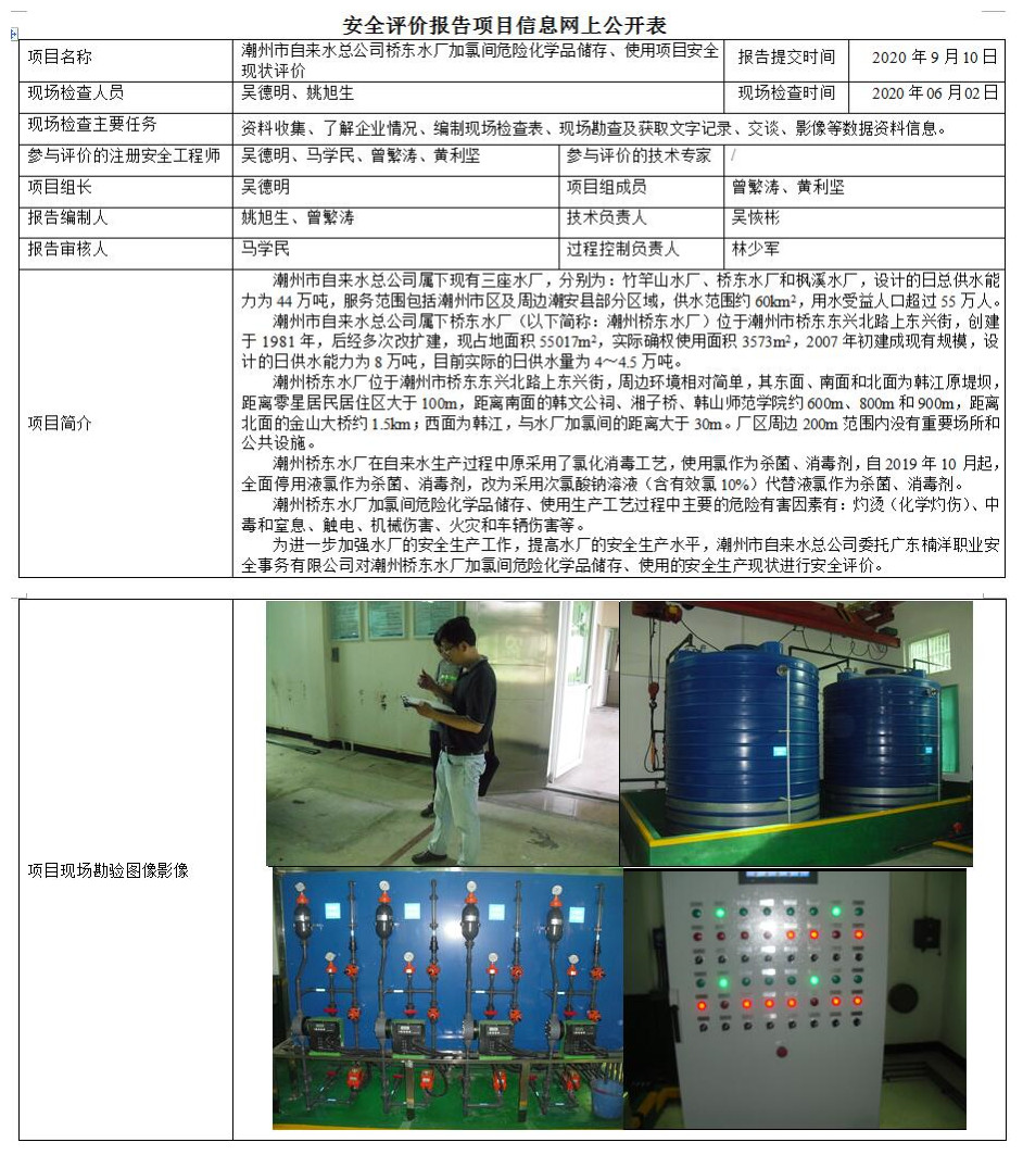 潮州市自来水总公司桥东水厂加氯间危险化学品储存、使用项目安全现状评价