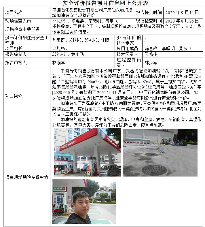 中国石化销售股份有限公司广东汕头澄海澄城加油站安全现状评价