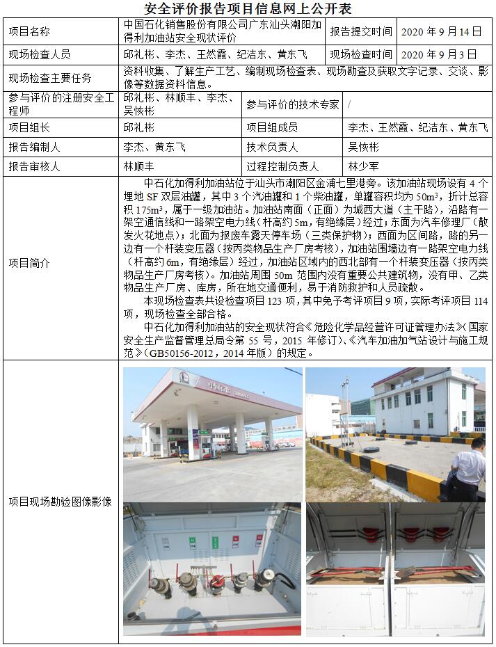 中国石化销售股份有限公司广东汕头潮阳加得利加油站安全现状评价