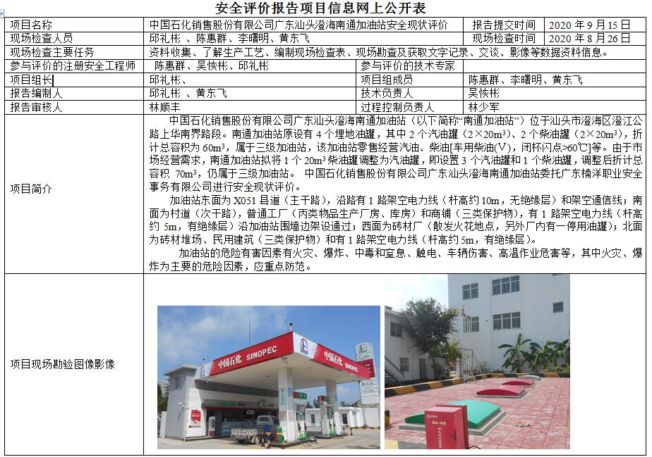 中国石化销售股份有限公司广东汕头澄海南通加油站安全现状评价