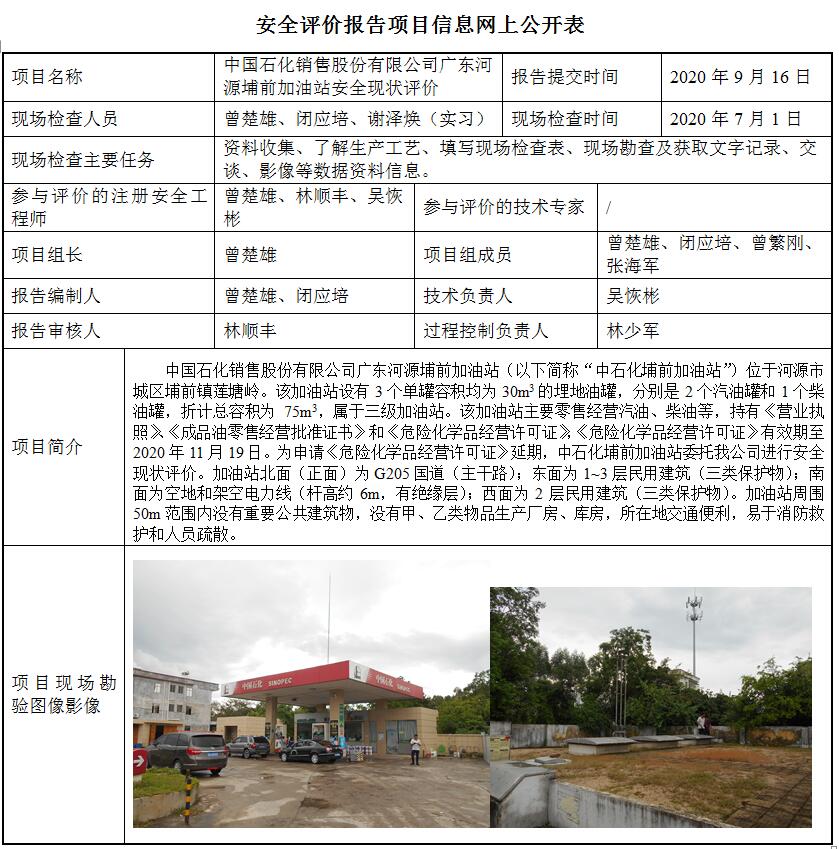 中国石化销售股份有限公司广东河源埔前加油站安全现状评价
