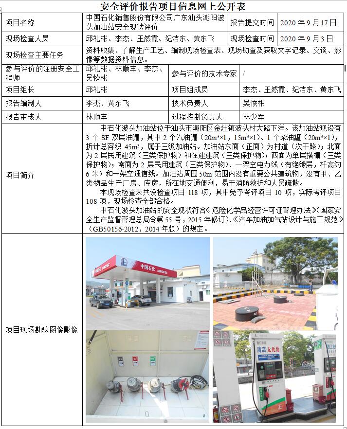 中国石化销售股份有限公司广东汕头潮阳波头加油站安全现状评价