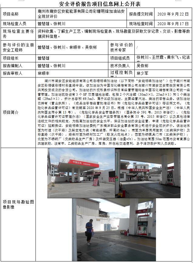 潮州市潮安区安能能源有限公司彩塘明锋加油站安全现状评价