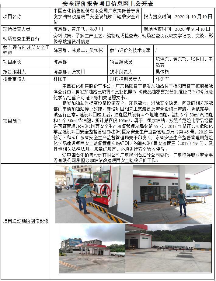 中国石化销售股份有限公司广东揭阳普宁腾发加油站改建项目安全设施竣工验收安全评价