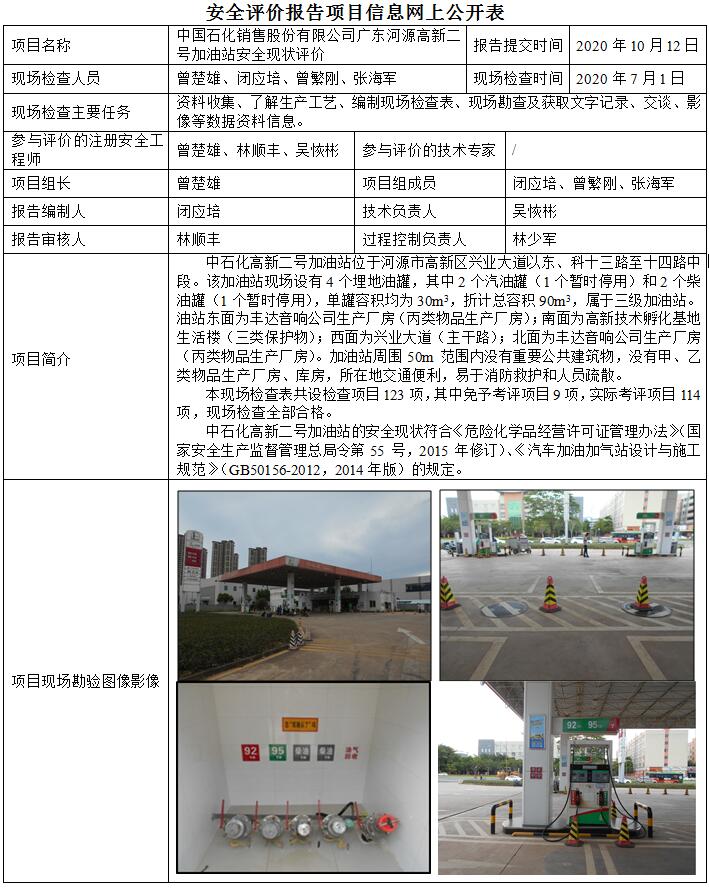 中国石化销售股份有限公司广东河源高新二号加油站安全现状评价