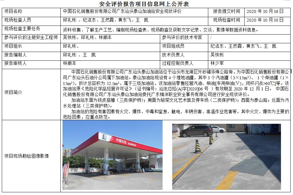 中国石化销售股份有限公司广东汕头泰山加油站安全现状评价