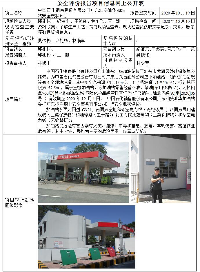 中国石化销售股份有限公司广东汕头汕华加油站安全现状评价