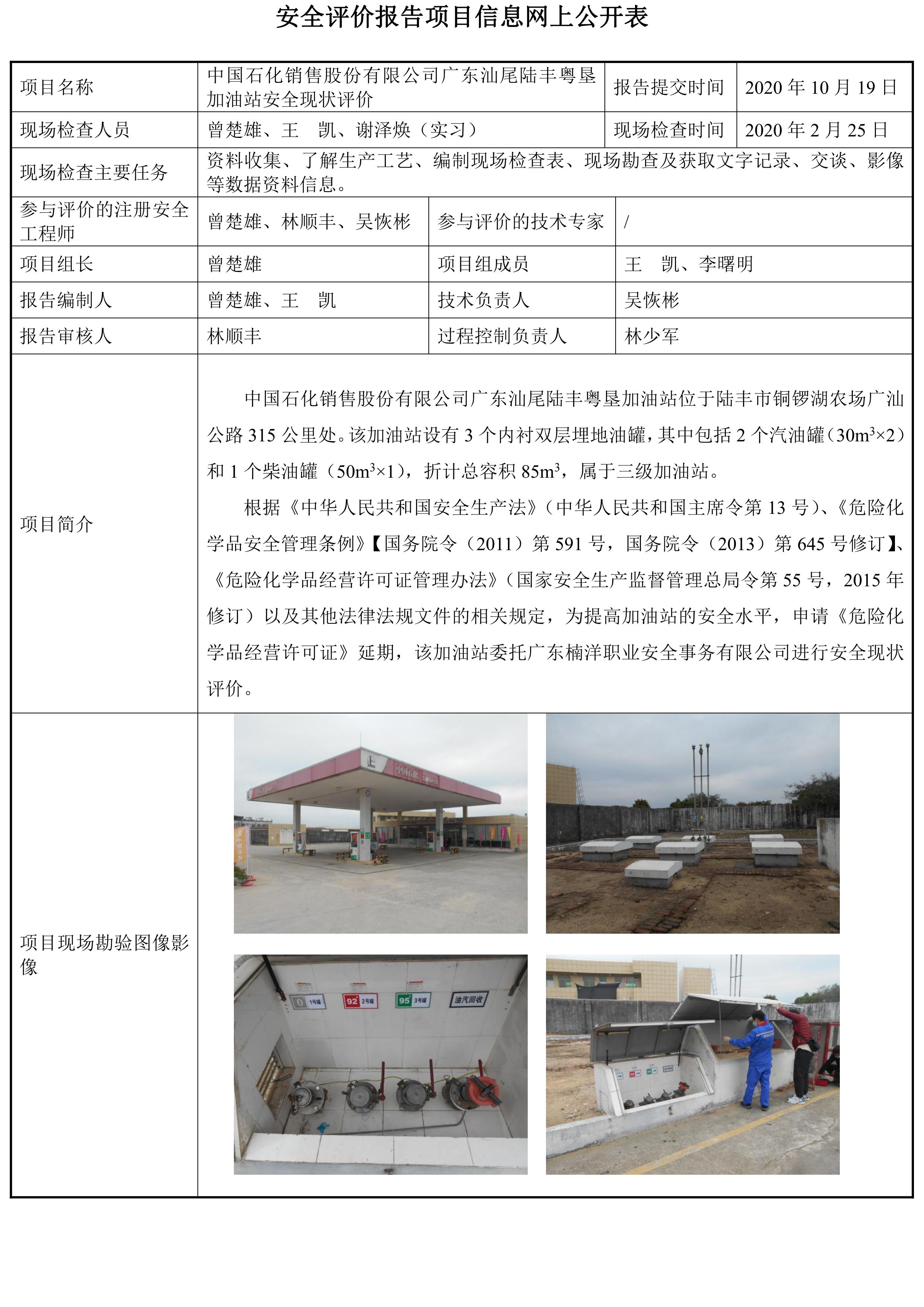 中国石化销售股份有限公司广东汕尾陆丰粤垦加油站安全现状评价