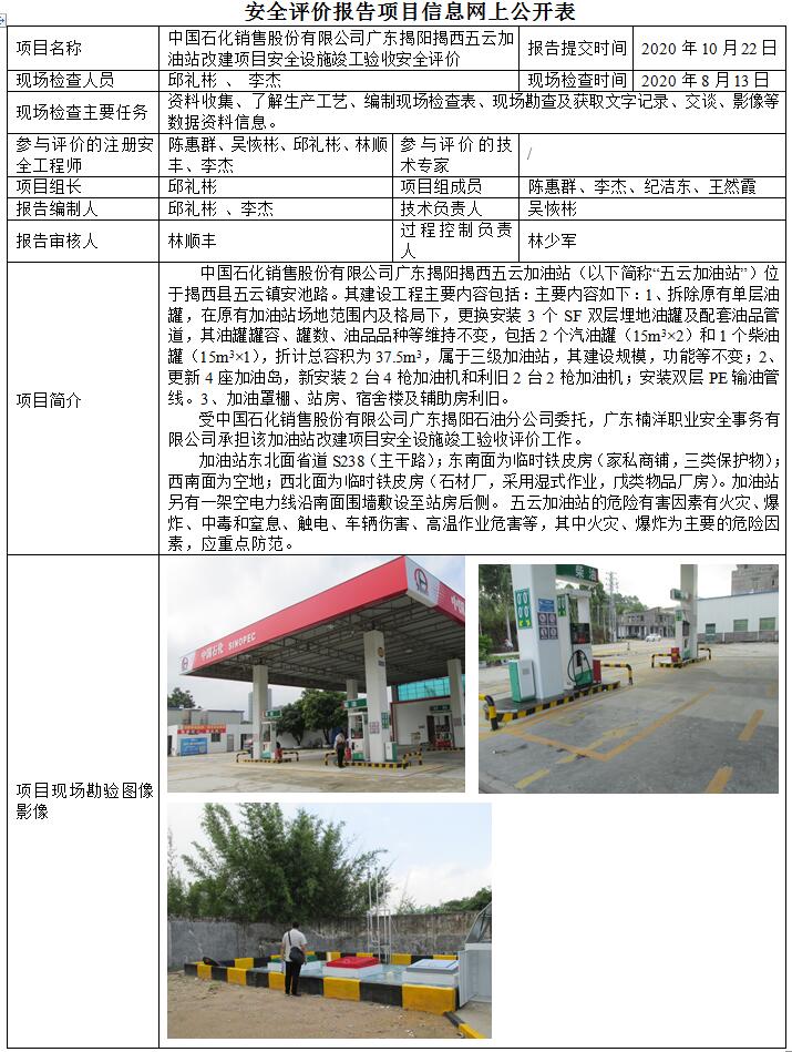中国石化销售股份有限公司广东揭阳揭西五云加油站改建项目安全设施竣工验收安全评价