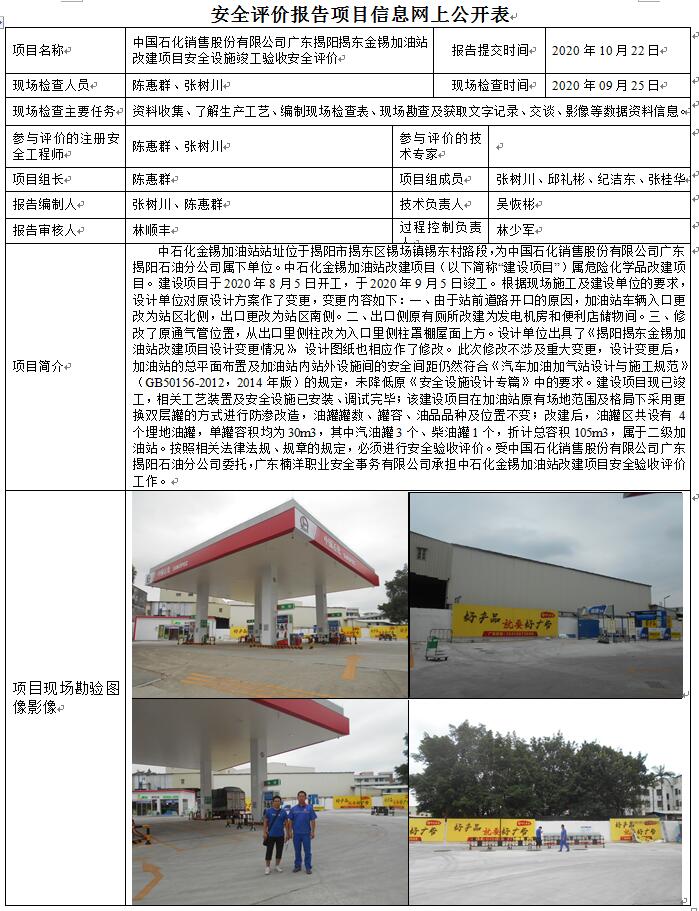 中国石化销售股份有限公司广东揭阳揭东金锡加油站改建项目安全设施竣工验收安全评价