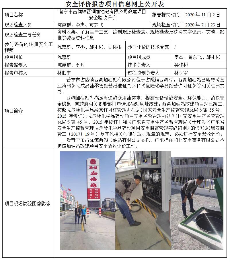 普宁市占陇镇西湖加油站有限公司加油站改建项目安全设施竣工验收安全评价