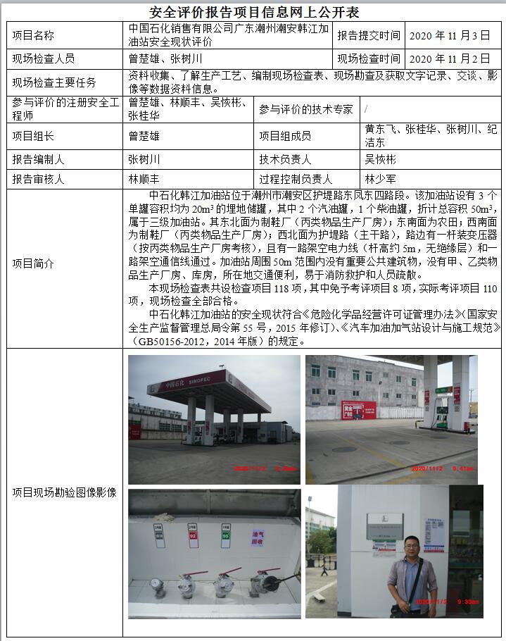 中国石化销售有限公司广东潮州潮安韩江加油站安全现状评价