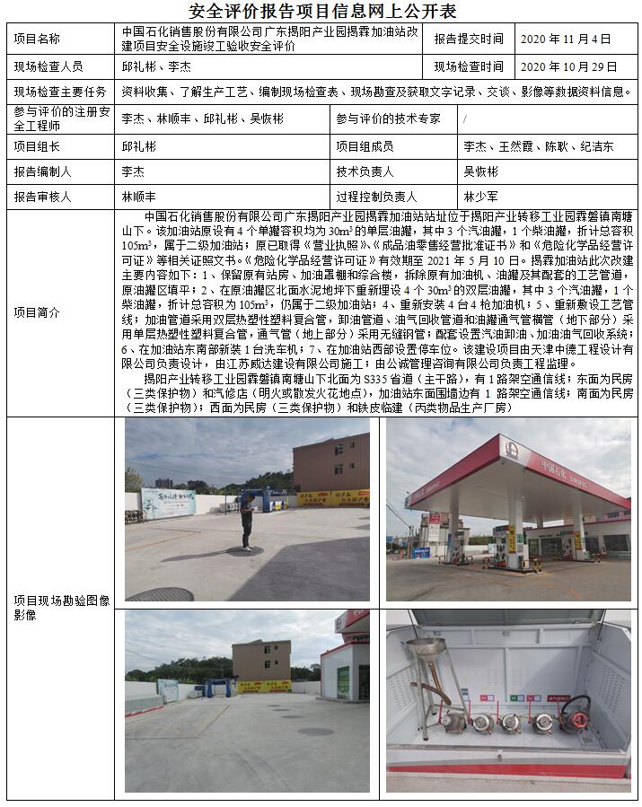 中国石化销售股份有限公司广东揭阳产业园揭霖加油站改建项目安全设施竣工验收安全评价