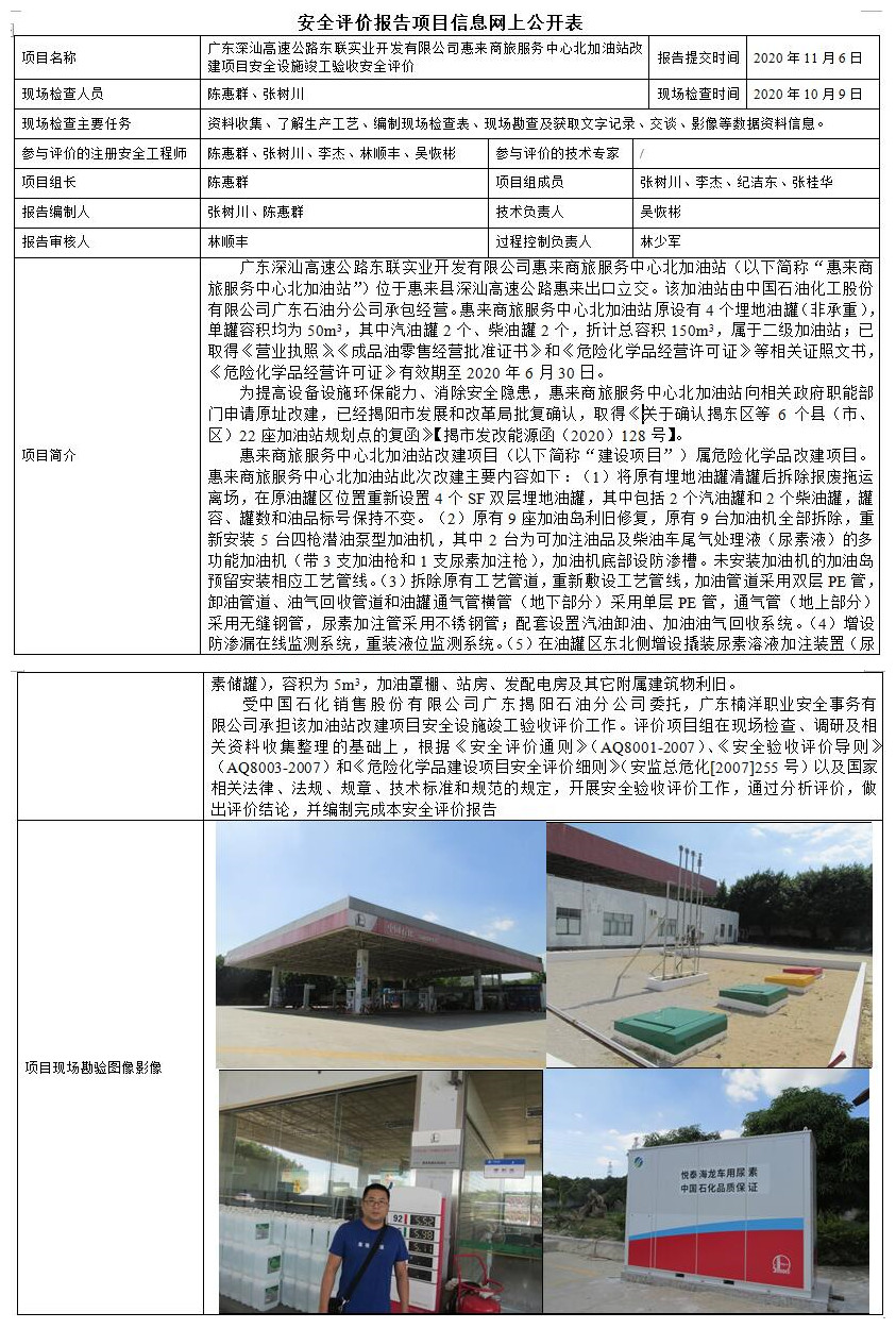 广东深汕高速公路东联实业开发有限公司惠来商旅服务中心北加油站改建项目安全设施竣工验收安全评价