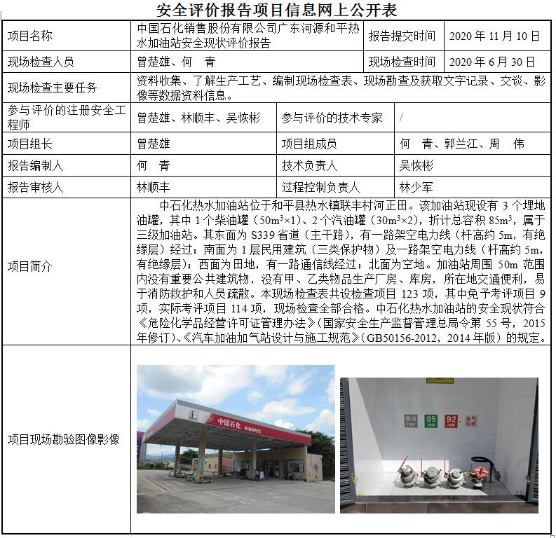 中国石化销售股份有限公司广东河源和平热水加油站安全现状评价