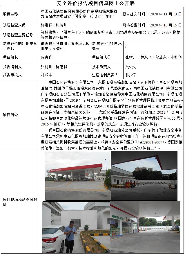 中国石化销售股份有限公司广东揭阳揭东揭潮加油站改建项目安全设施竣工验收安全评价
