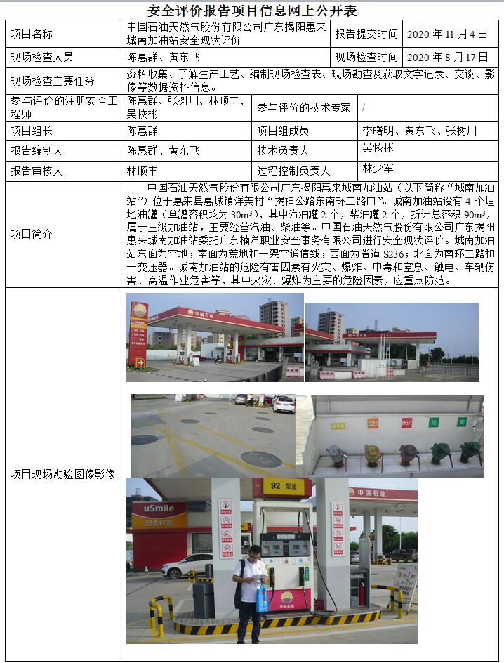 中国石油天然气股份有限公司广东揭阳惠来城南加油站安全现状评价