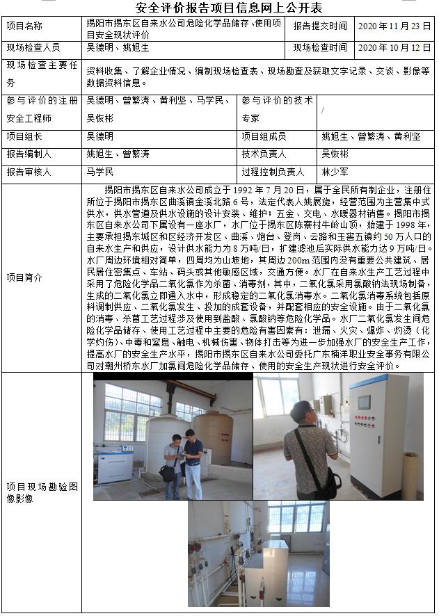 揭阳市揭东区自来水公司危险化学品储存、使用项目安全现状评价