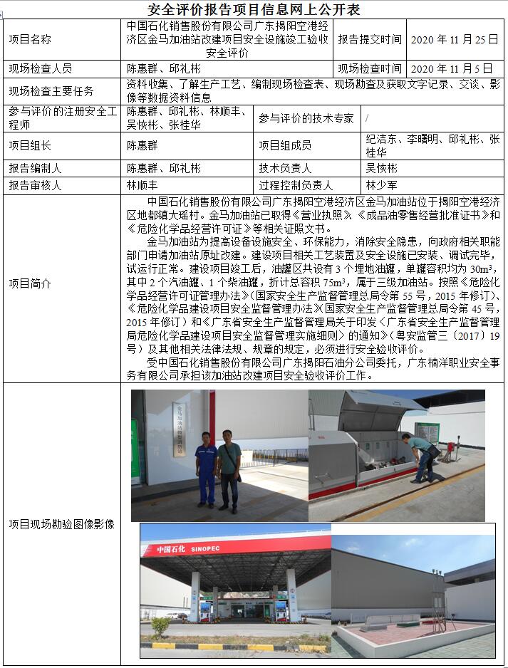 中国石化销售股份有限公司广东揭阳空港经济区金马加油站改建项目安全设施竣工验收安全评价