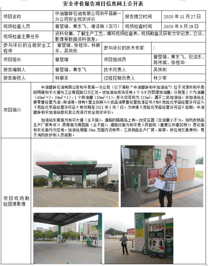 中油碧辟石油有限公司和平县第一分公司(中油碧辟和平加油站)安全现状评价