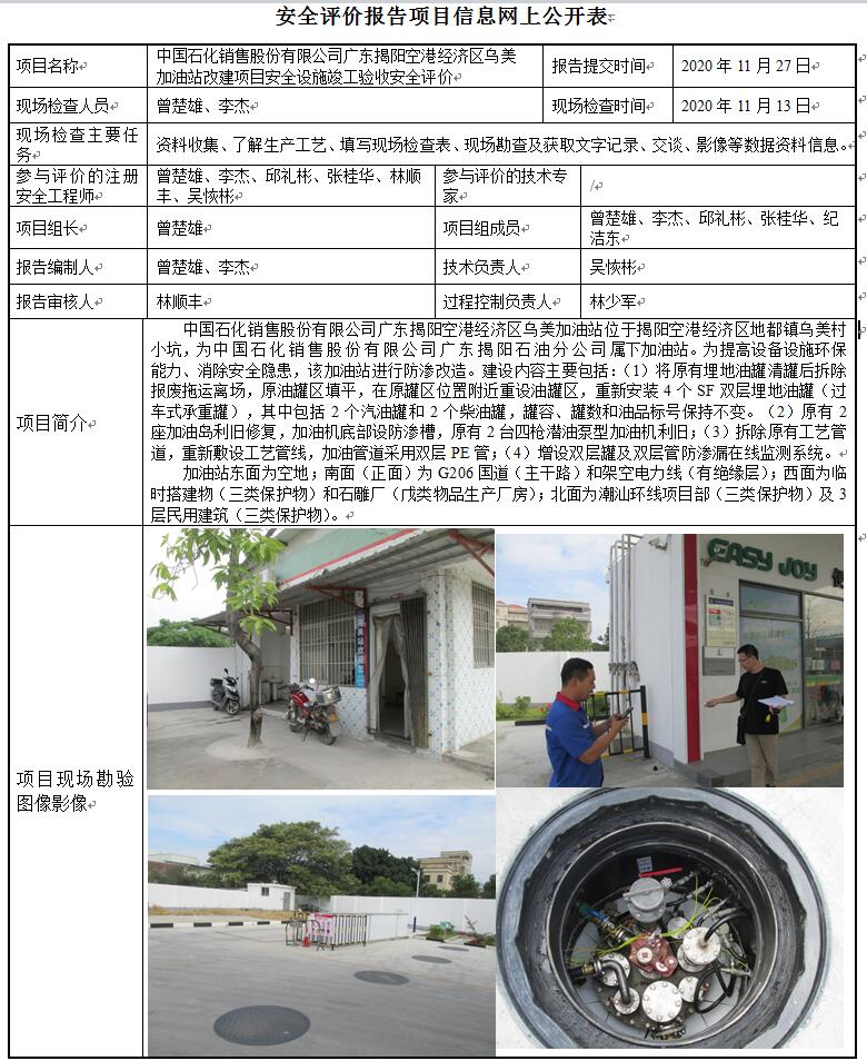中国石化销售股份有限公司广东揭阳空港经济区乌美加油站改建项目安全设施竣工验收安全评价