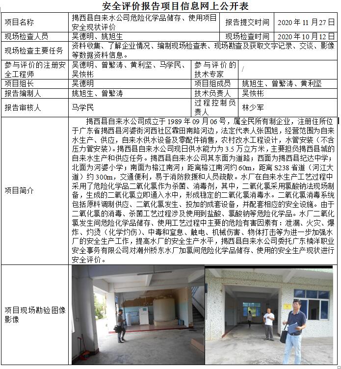 揭西县自来水公司危险化学品储存、使用项目安全现状评价