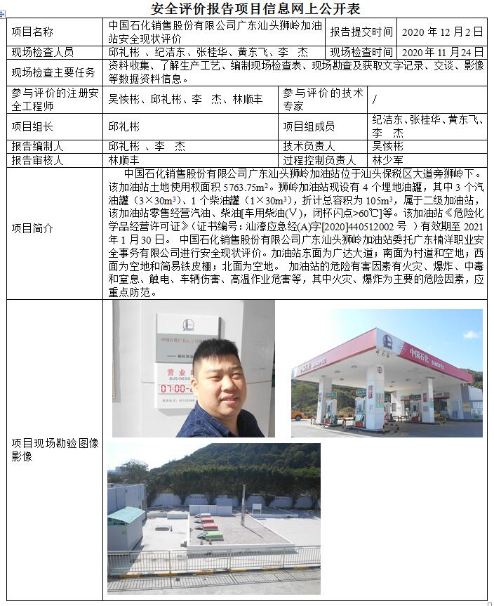 中国石化销售股份有限公司广东汕头狮岭加油站安全现状评价