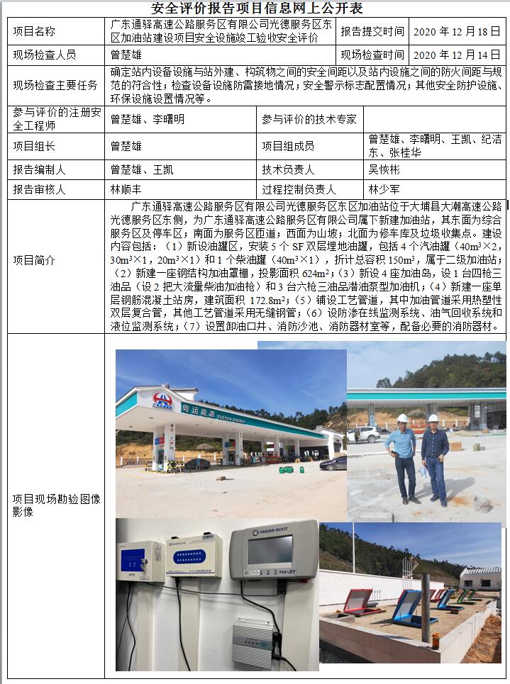 广东通驿高速公路服务区有限公司光德服务区东区加油站建设项目安全设施竣工验收安全评价