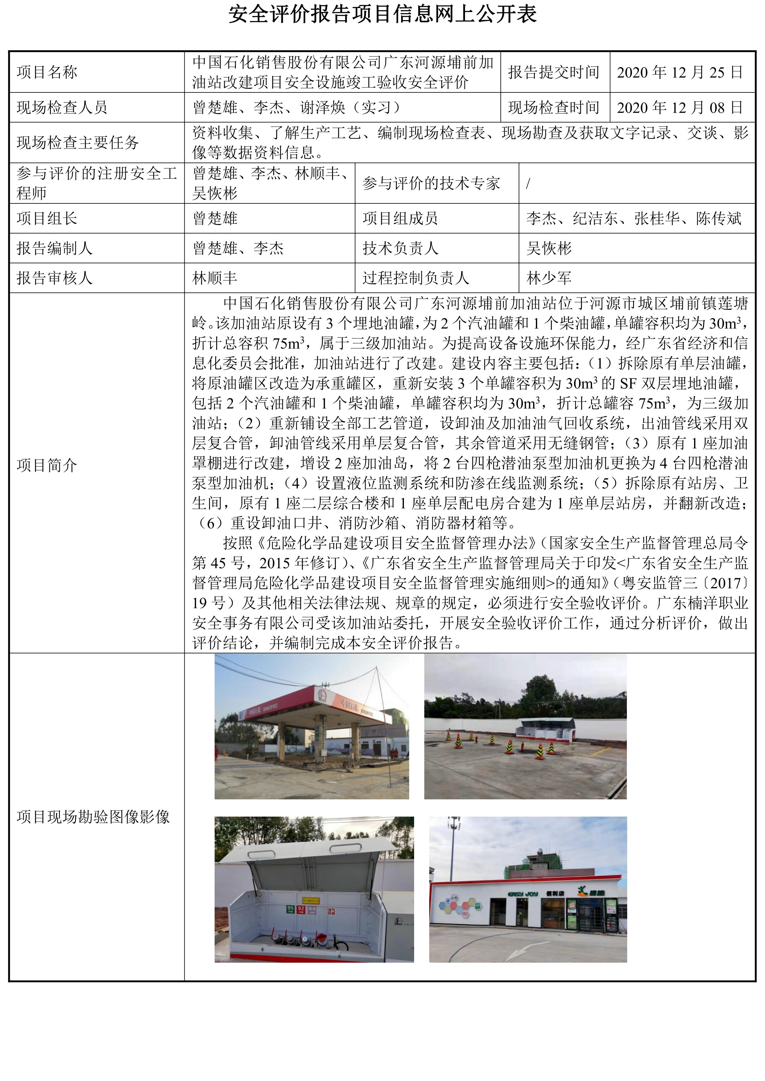 中国石化销售股份有限公司广东河源埔前加油站改建项目安全设施竣工验收安全评价