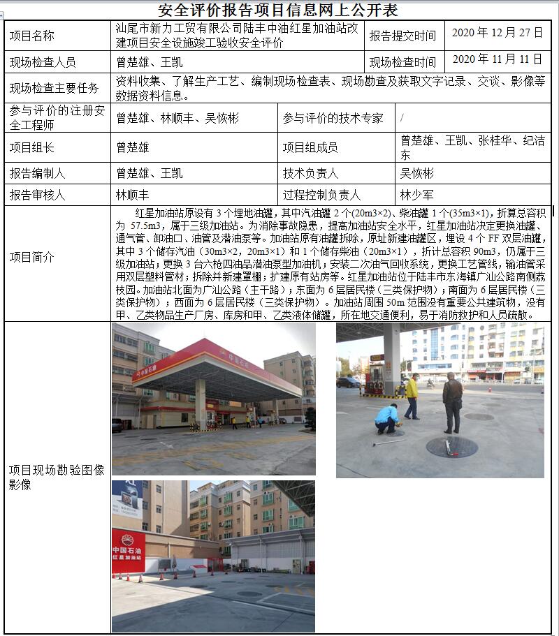 汕尾市新力工贸有限公司陆丰中油红星加油站改建项目安全设施竣工验收安全评价