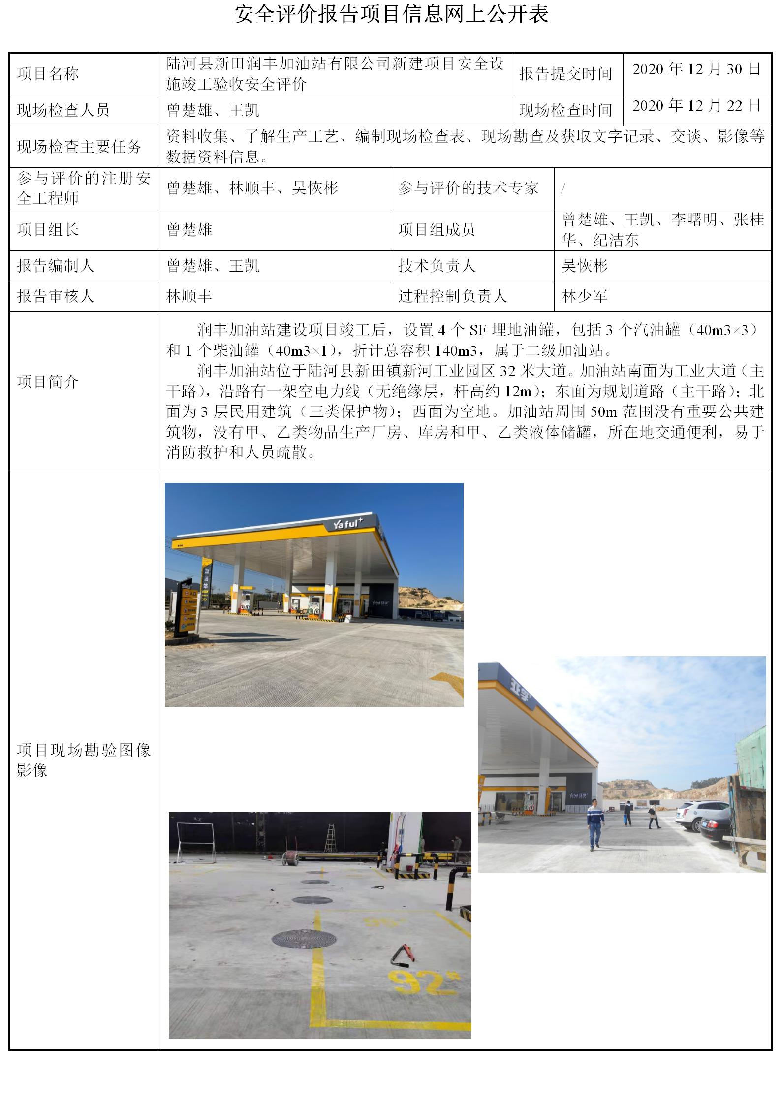 陆河县新田润丰加油站有限公司新建项目安全设施竣工验收安全评价