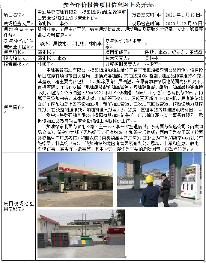 中油碧辟石油有限公司揭阳梅塘加油站改建项目安全设施竣工验收安全评价