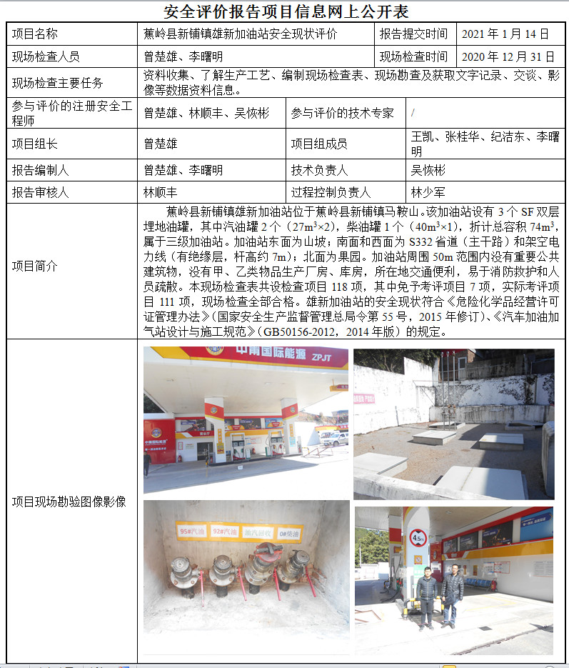 蕉岭县新铺镇雄新加油站安全现状评价