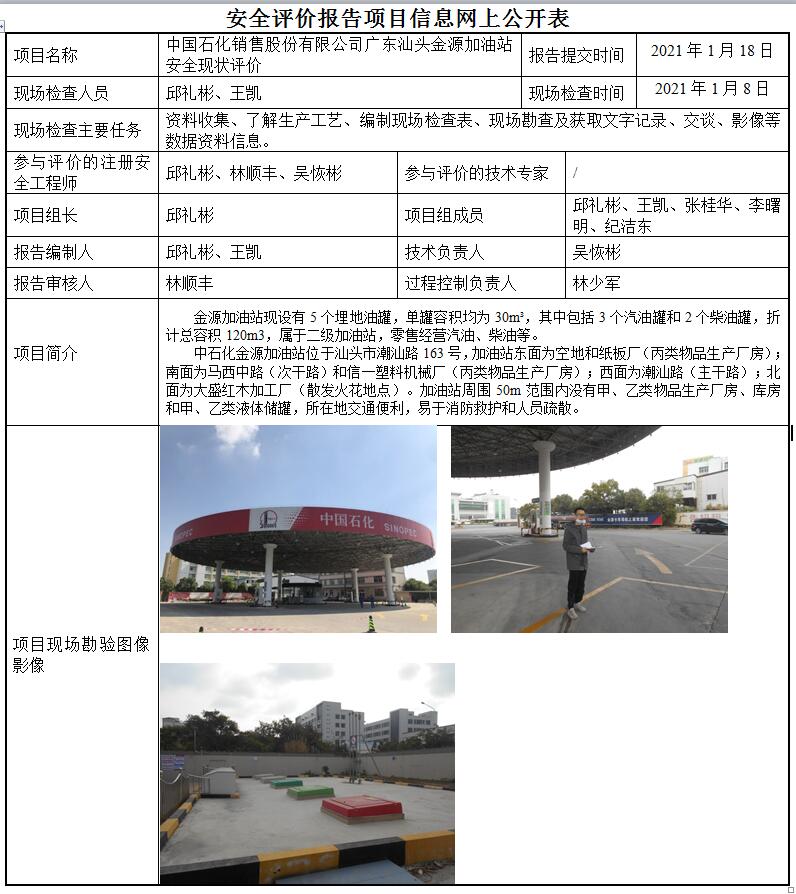 中国石化销售股份有限公司广东汕头金源加油站安全现状评价