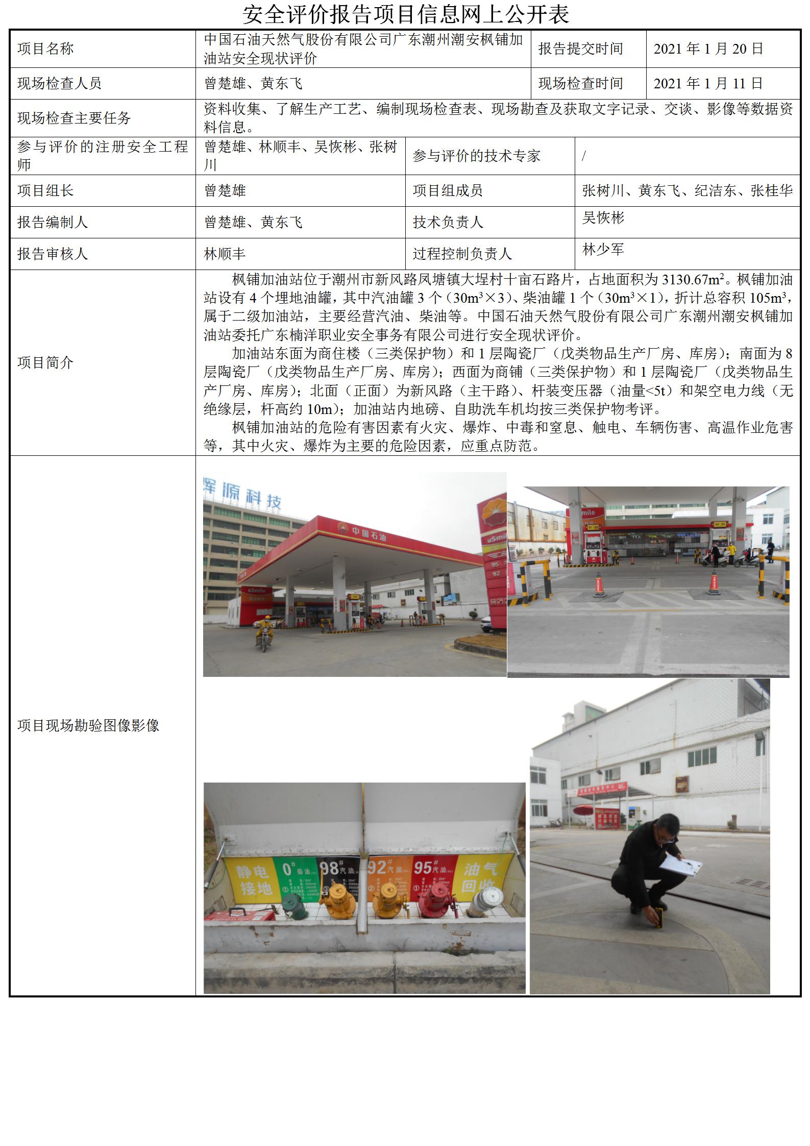中国石油天然气股份有限公司广东潮州潮安枫铺加油站安全现状评价