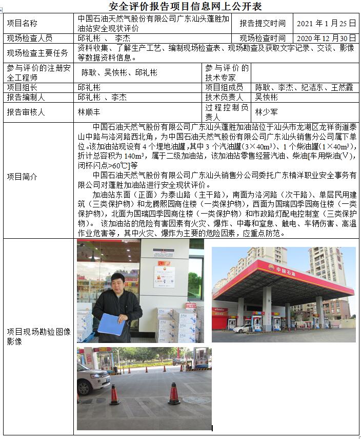 中国石油天然气股份有限公司广东汕头蓬胜加油站安全现状评价