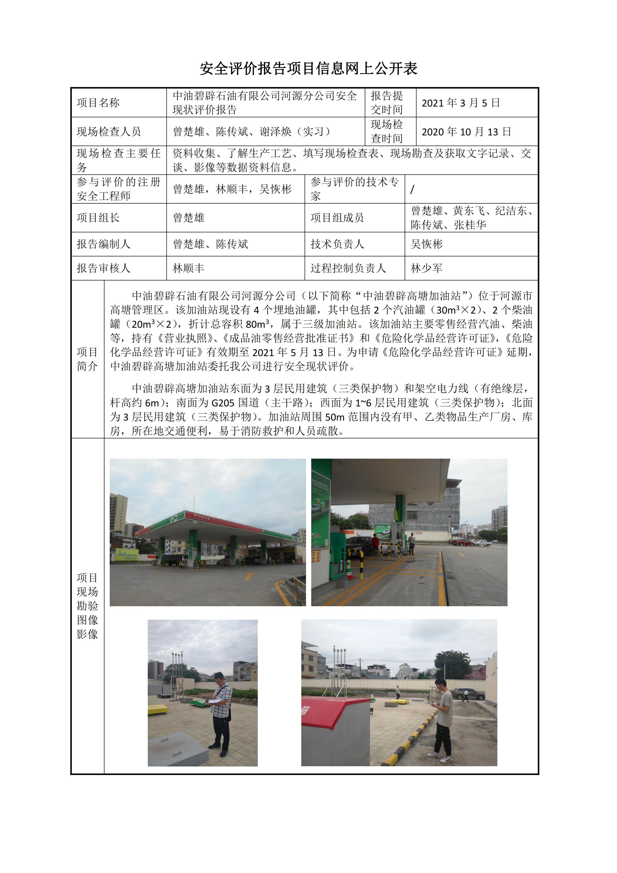 中油碧辟石油有限公司河源分公司(中油碧辟高塘加油站)安全现状评价