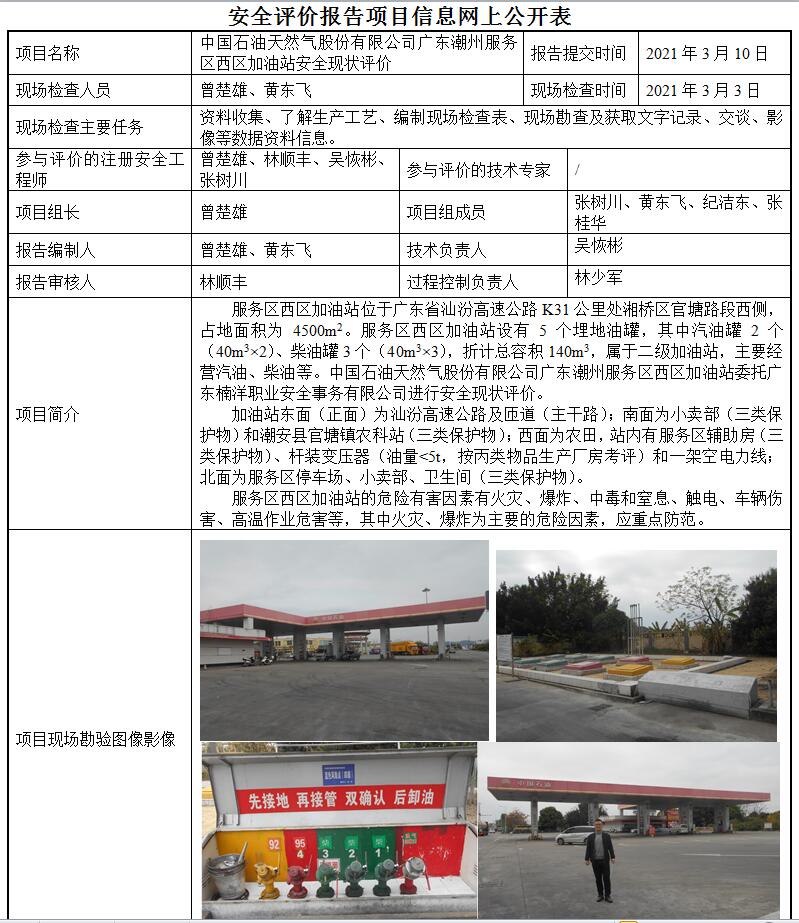 中国石油天然气股份有限公司广东潮州服务区西区加油站安全现状评价