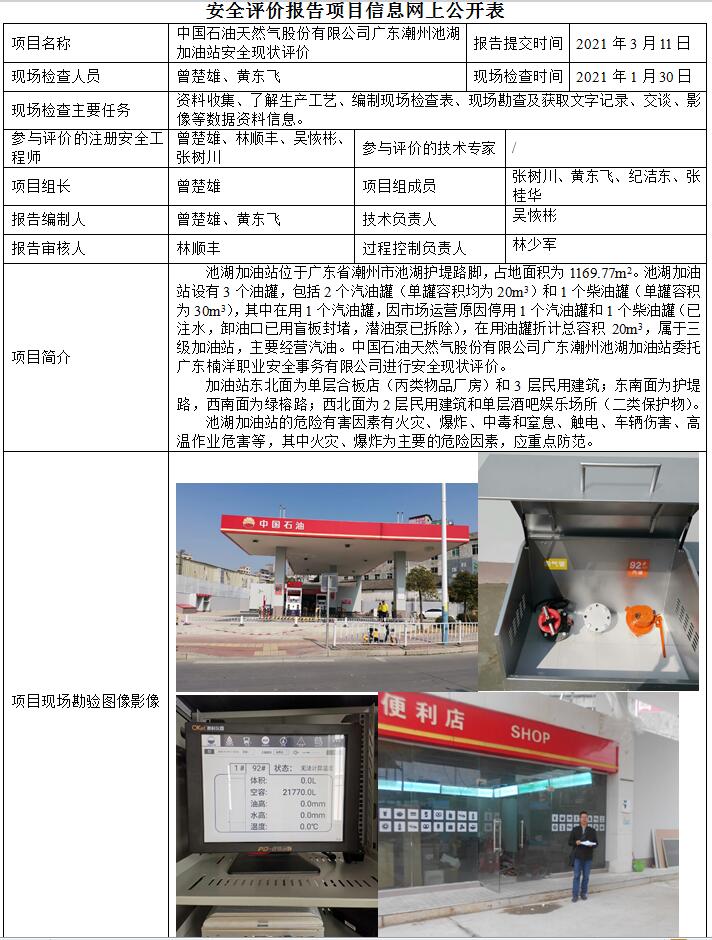 中国石油天然气股份有限公司广东潮州池湖加油站安全现状评价