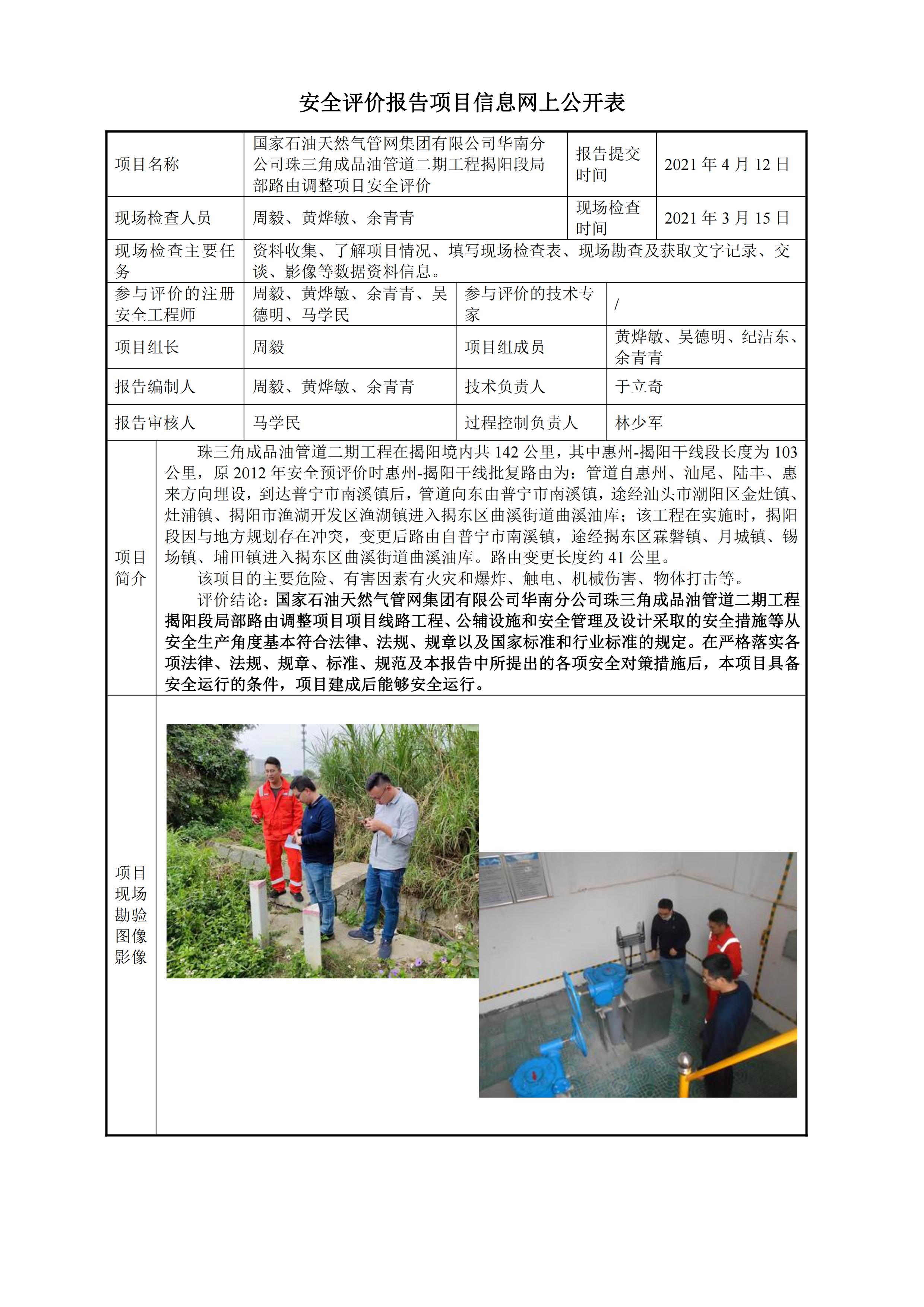国家石油天然气管网集团有限公司华南分公司珠三角成品油管道二期工程揭阳段局部路由调整项目安全评价