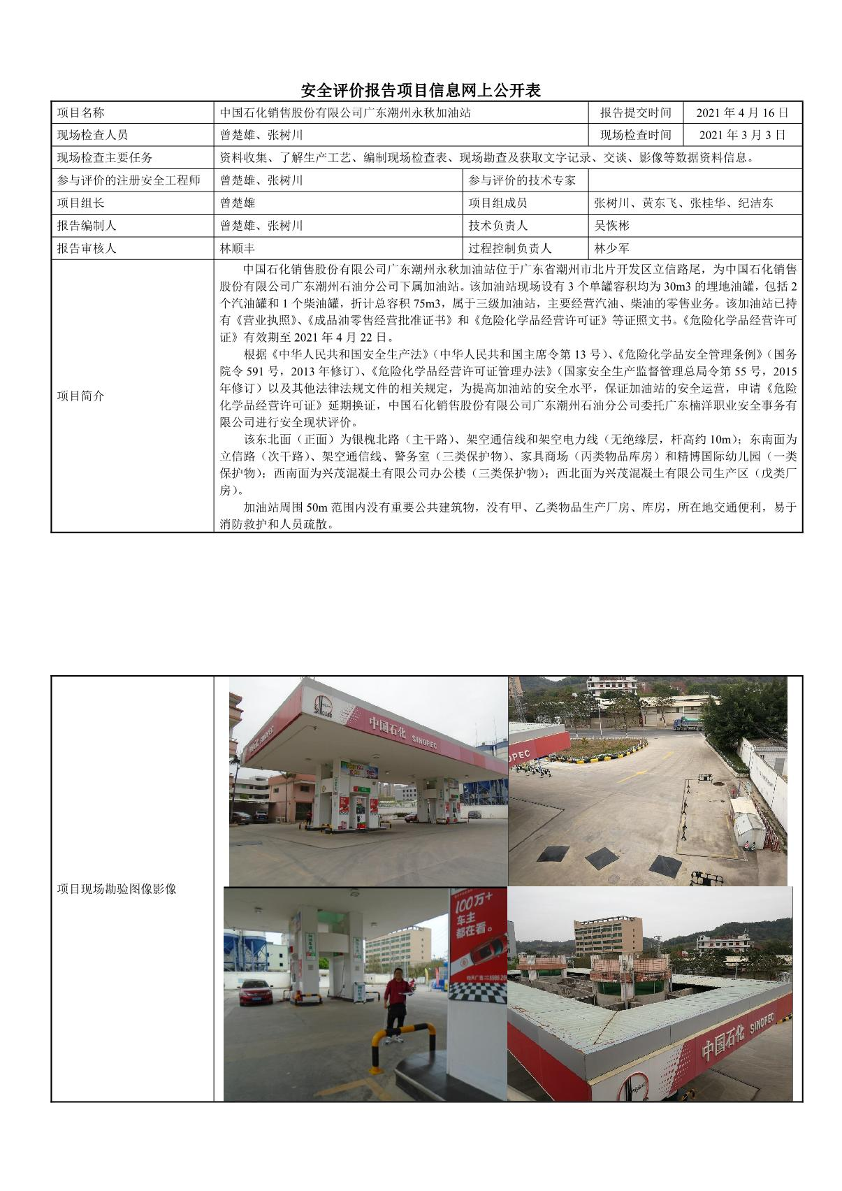 中国石化销售股份有限公司广东潮州永秋加油站安全现状评价