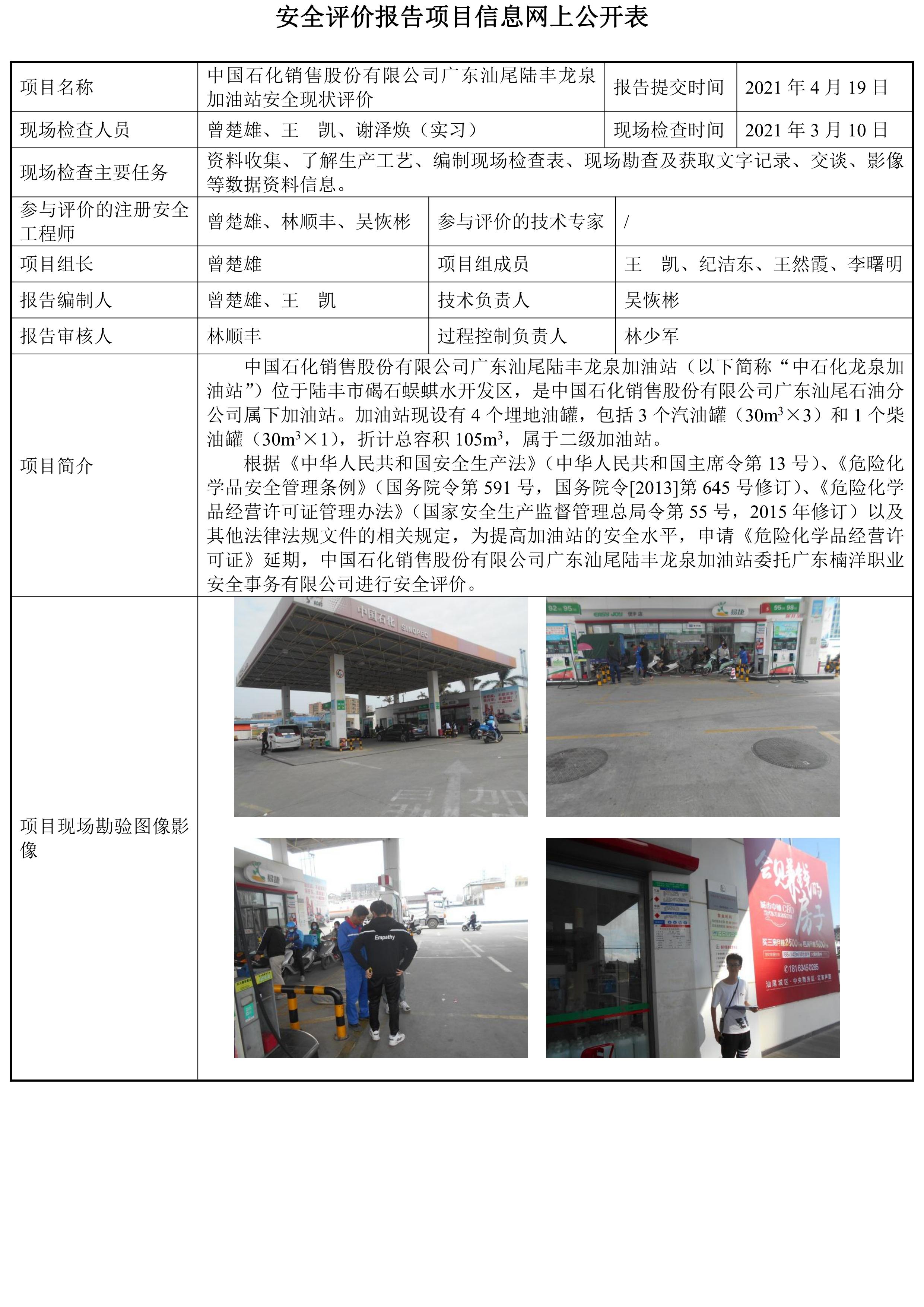中国石化销售股份有限公司广东汕尾陆丰龙泉加油站安全现状评价