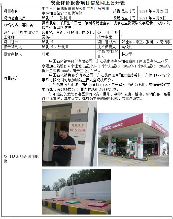 中国石化销售股份有限公司广东汕头南澳亨翔加油站安全现状评价