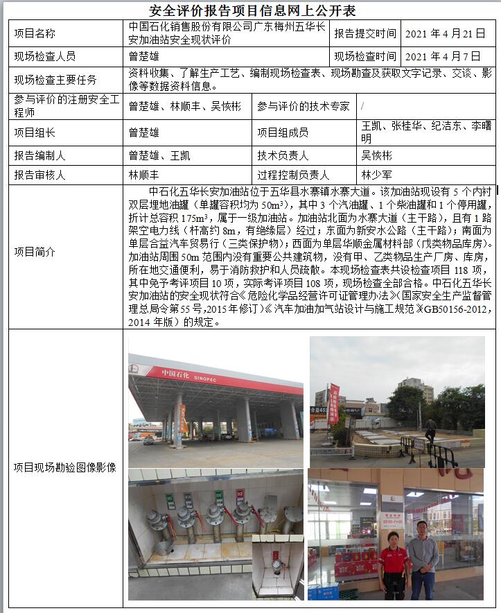 中国石化销售股份有限公司广东梅州五华长安加油站安全现状评价