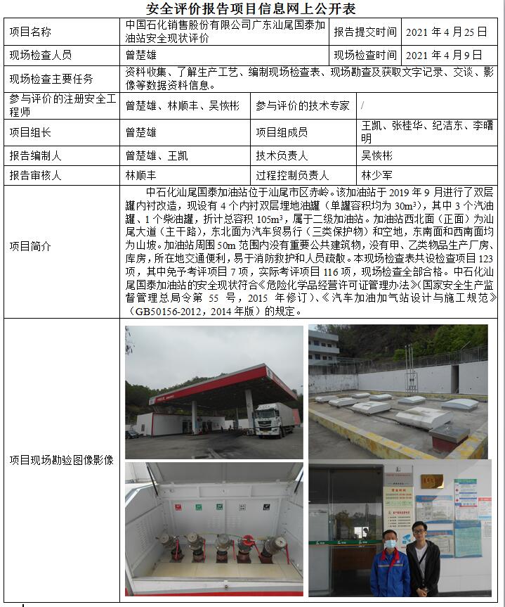 中国石化销售股份有限公司广东汕尾国泰加油站安全现状评价