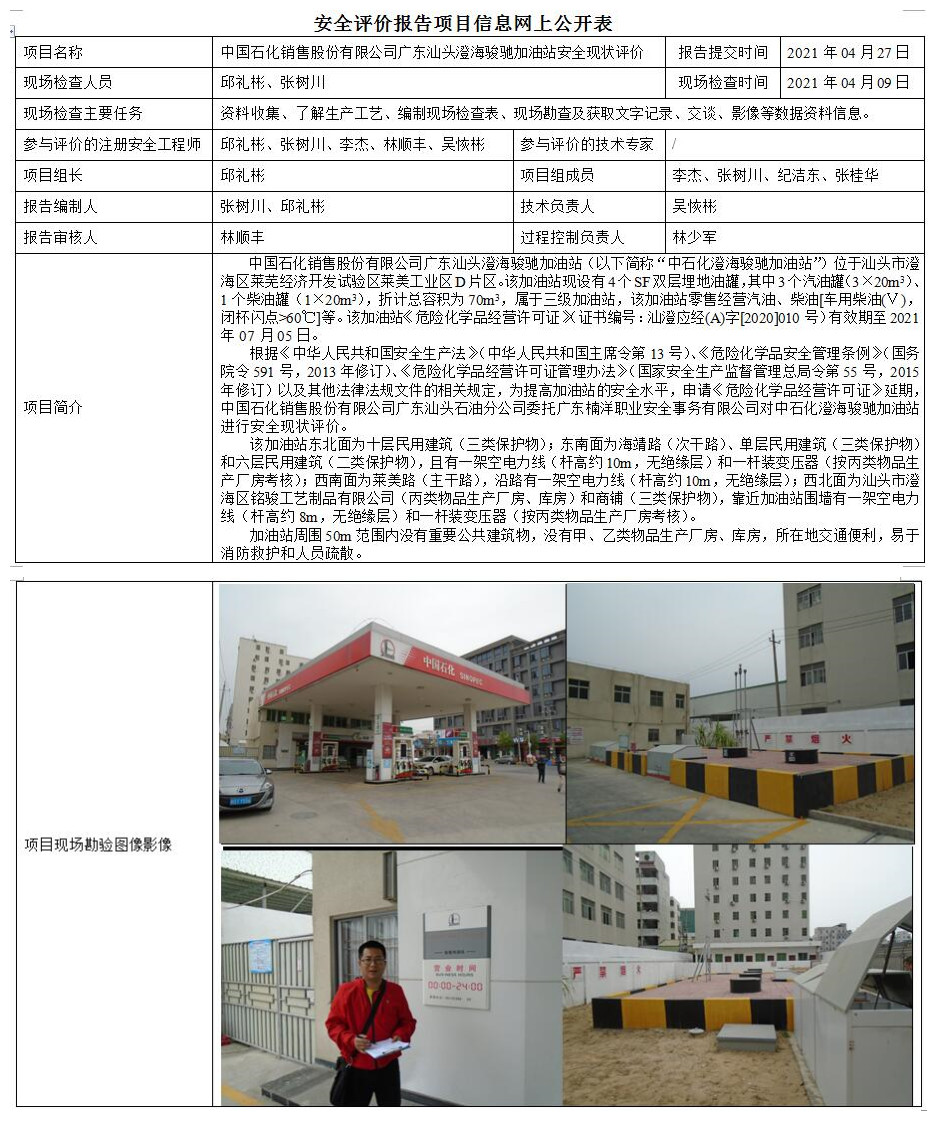 中国石化销售股份有限公司广东汕头澄海骏驰加油站安全现状评价