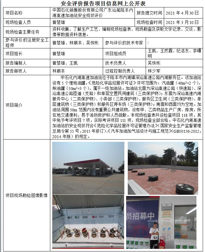 中国石化销售股份有限公司广东汕尾陆丰内湖高速加油站安全现状评价