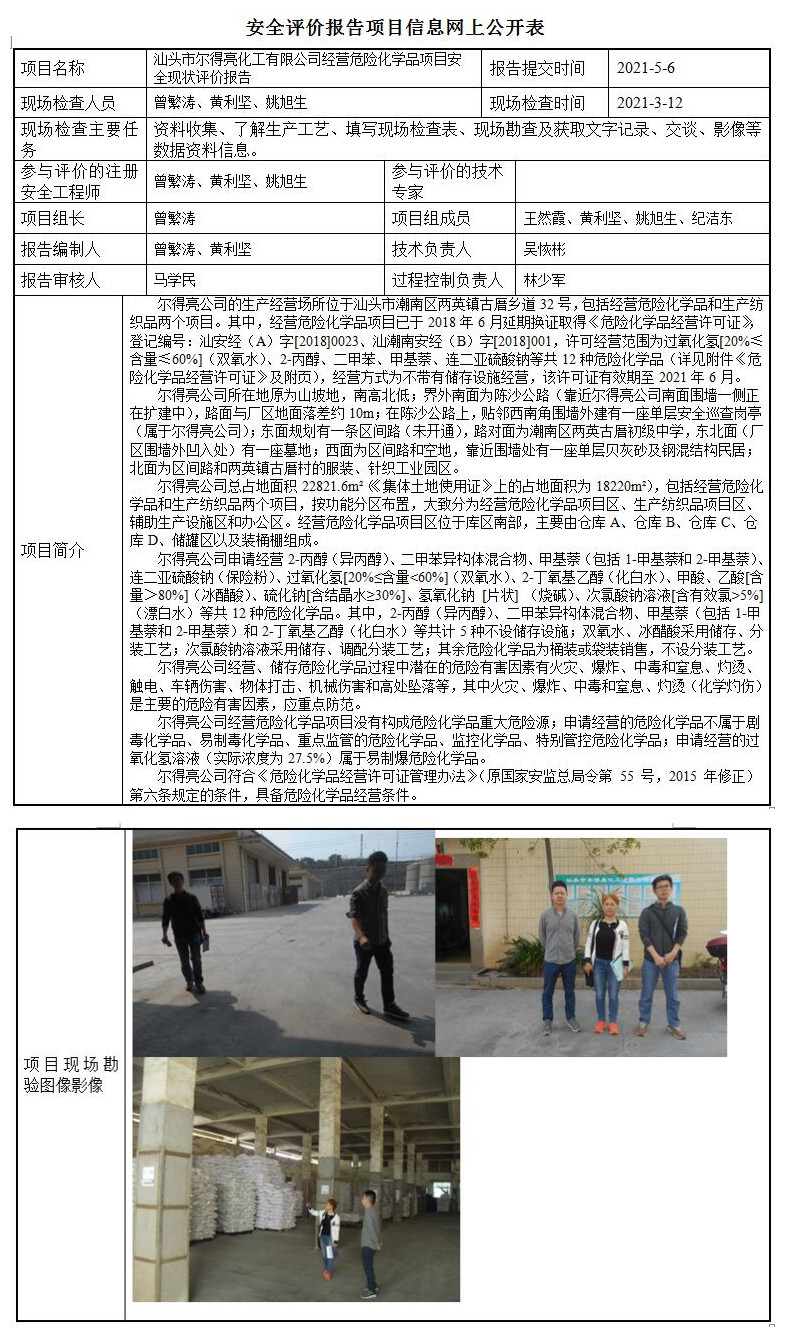 汕头市尔得亮化工有限公司经营危险化学品项目安全现状评价