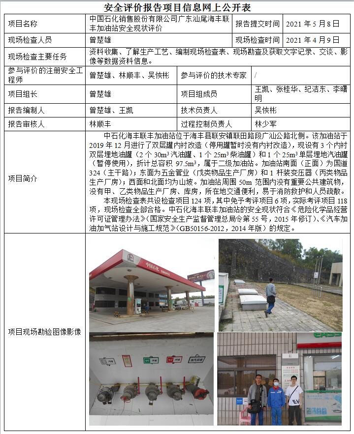 中国石化销售股份有限公司广东汕尾海丰联丰加油站安全现状评价