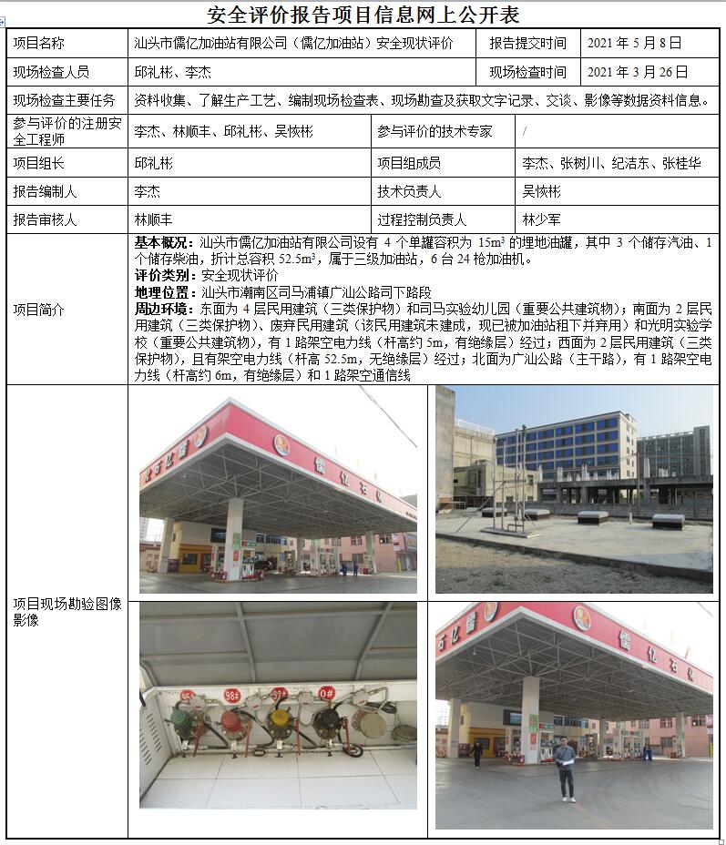 汕头市儒亿加油站有限公司(儒亿加油站)安全现状评价